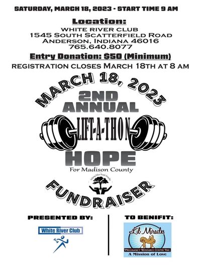 Jason Witter of the White River Club is holding another awesome event to raise money for Lil Miracles. You don't have to be the worlds strongest lifter to win. You can win points by the money you raise for the event. Thank you Jason. Thank you Jackie Surface-Farmer and Marshall Farmer for keeping his dream alive.”